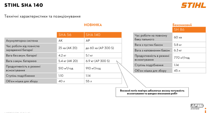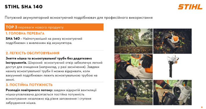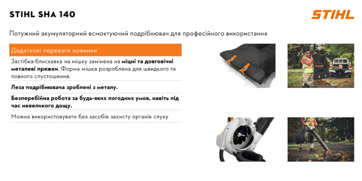 Надзвичайно потужний акумуляторний садовий пилосос STIHL SHA 140 системи AP ідеально підходить для професіоналів ландшафтного дизайну, комунальних робіт і садівничих служб: для ефективного збору листя, трави та залишків живоплоту, а також їх подрібнення безпосередньо в апараті. Незалежно від того, чи працюєте ви на таких поверхнях, як асфальт, гравій, газони, луки або клумби, відмінна потужність всмоктування STIHL SHA 140 дозволяє працювати ефективно і швидко.