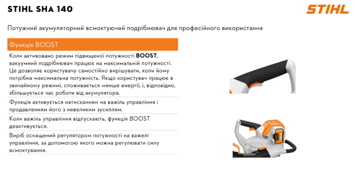 Безшумна робота акумуляторного садового пилососа STIHL SHA 140 дозволяє виконувати роботи з прибирання без захисту органів слуху. За допомогою важеля перемикання режимів потужність всмоктування можна плавно регулювати та адаптувати до відповідних вимог. Для забезпечення максимальної потужності всмоктування SHA 140 оснащений функцією форсування, яку можна легко активувати за допомогою важеля перемикання режимів. Металеві леза подрібнювача забезпечують ефективне подрібнення зібраного матеріалу, який потім збирається безпосередньо в 55-літровий мішок для збору. Мішок можна зняти для спорожнення без інструментів, а завдяки міцним, довговічним металевим затискачам його можна легко відкривати і закривати. Ще однією перевагою SHA 140 є функція керування повітряним потоком, яка забезпечує стабільно високу потужність всмоктування незалежно від рівня заповнення та забруднення 55-літрового мішка для збору сміття. Крім того, завдяки продуманій конструкції STIHL SHA 140 цей пилосос можна відкривати без інструментів для чищення, коли всмоктувальна насадка лежить на землі.