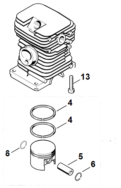 Включає циліндр з поршнем Ø 38 мм, компресійні кільця, палець, стопорні кільця, гвинти циліндра.
